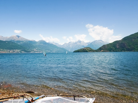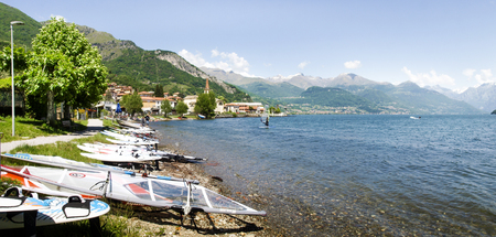 Pianello del Lario, Italy - May 16, 2015: Windsurf boards deposited on the beach by the lake, waiting to be used.