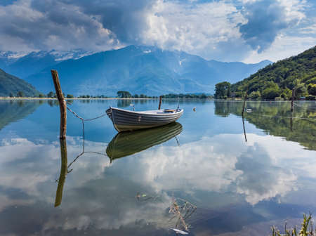 sunrise at Lake Mezzola in Northern Italy, scenic landscape with water, mountains and trees, boat in the foreground