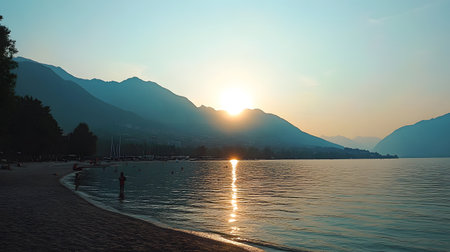 A serene sunset view over tranquil water, framed by majestic mountains, perfect for relaxation and nature appreciation.
