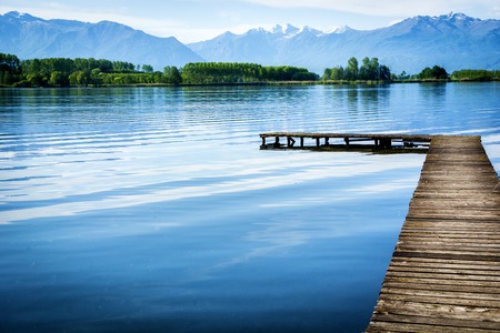 Wooden small pier over peaceful lake. Daytime shot
