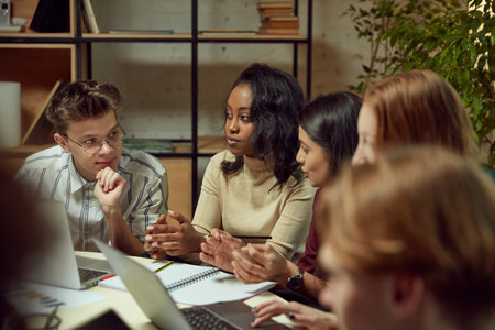 Multiracial group of young creative people in casual wear meeting brainstorming ideas about new paperwork project colleagues working together planning success strategy enjoy teamwork in small office