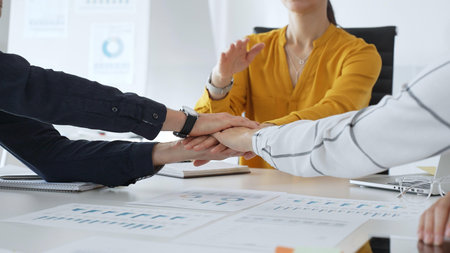 Business professionals joining hands over workplace documents, symbolizing collaborative spirit and shared workplace success