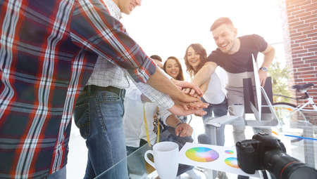 A close-up image of a team of developers or graphic designers putting their hands together at working table in office