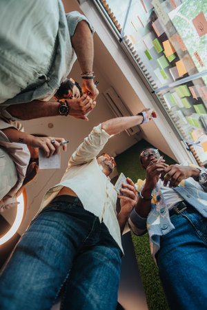 Enthusiastic teamwork is depicted as diverse hands unite over a detailed brainstorming sheet filled with colorful notes, illustrating a dynamic marketing project planning session.