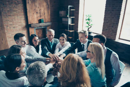 Top above high angle view nice luxury chic attractive elegant smart cheerful experts putting palms gathering over table desk desktop charts data at modern industrial loft interior work place station
