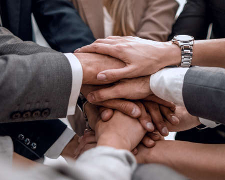 Close up view of young business people putting their hands together. Stack of hands. Unity and teamwork concept.