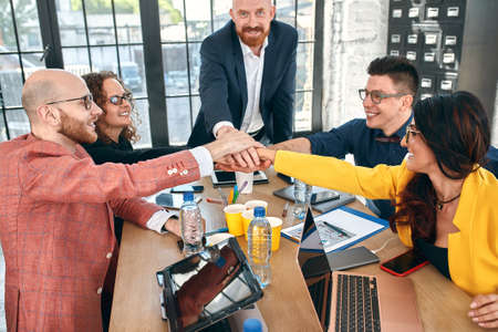 International team of competent office workers holding their hands together in circle after profitable cooperation at office room. Modern technology for work on desk. Teamwork concept.