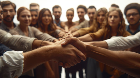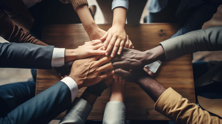Diverse hands symbolizing teamwork, empathy, partnership, and social connection in business