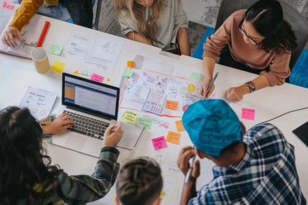A dynamic team engages in collaborative project planning with sticky notes and colorful markers, discussing marketing strategies and sharing creative ideas around a table.