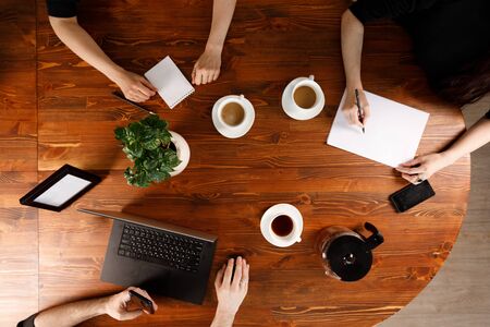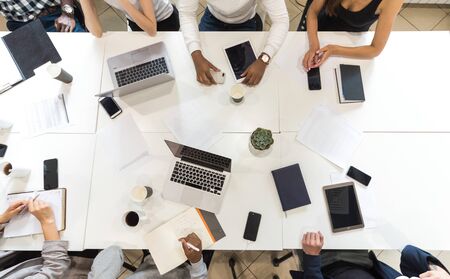 Top view of business people working together at meeting table in office. People corporate business team concept.