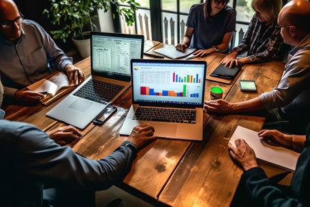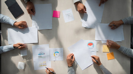 Top view of business people discussing the charts and graphs showing the results of their successful teamwork
