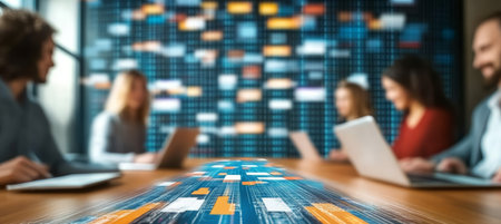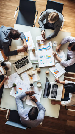 office scene from above: collaborative data analysis through AI, transform business intelligence.