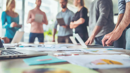 Blurred business team discussing a project in an office, focusing on a table with laptops and documents, representing teamwork.