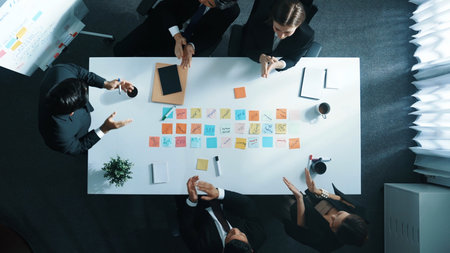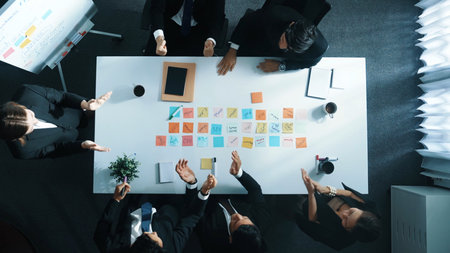Top view of smart project manager talking and explain idea and clapping idea. Aerial view of business people applause to successful project. Aerial view of team clap hands at meeting room. Symposium.
