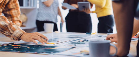 Close up of designer hands design logo graphic together at meeting. Professional graphic working together and brainstorming idea about product design at table with colorful sticky notes. Symposium.