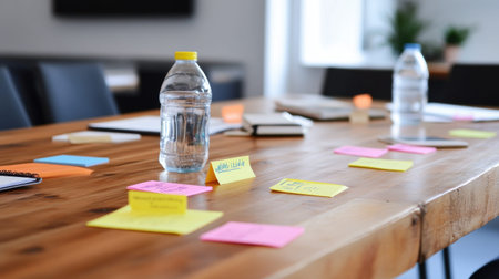 A modern office scene featuring a large wooden meeting table with colorful sticky notes and bottled water, promoting a creative space for brainstorming and collaboration.