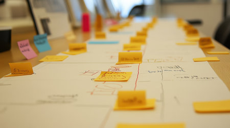 A vibrant collection of sticky notes and papers arranged on a wooden table showcases a collaborative brainstorming session in a contemporary office. Hands actively engage.