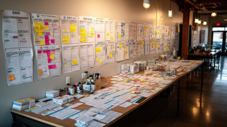 A vibrant workspace with an array of colorful notes, documents, and charts lining the walls and tables. Ideal for showcasing organization and collaboration in an office environment.