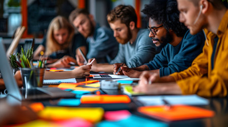 Blurred image of young professionals collaborating in an office space, surrounded by colorful sticky notes and laptops, fostering creativity and teamwork. AI generation