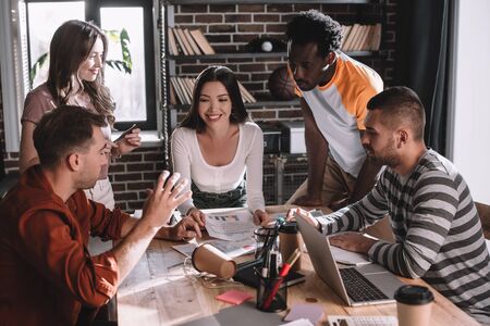 young, positive multicultural businesspeople brainstorming near desk in office