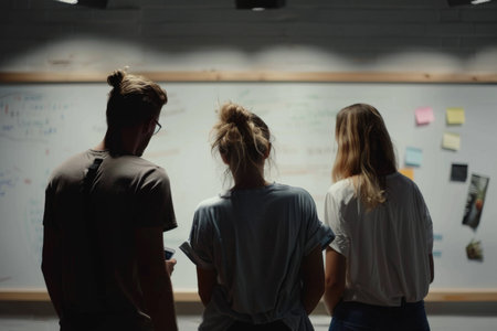 Young students business people brainstorm teamwork idea generation discussion strategy whiteboard plan sticky notes talented colleagues proposing creative solution leadership role cooperation meeting