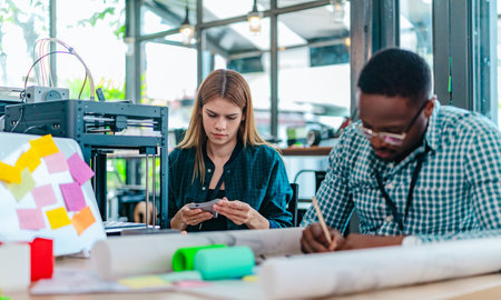 A diverse team of startup professionals collaborates on a 3D printing project in a modern workspace. Highlighting innovation, teamwork, and the prototyping process in a creative tech environment.