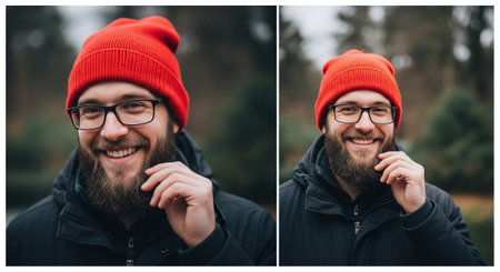 A smiling man wearing a red beanie and glasses, outdoors in a natural setting. He has a beard and is casually dressed in a black jacket, exuding a cheerful demeanor.