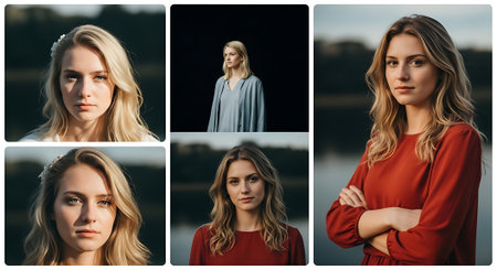 A images of five photographs featuring a young woman with blonde hair in various settings and attire, showcasing different expressions and styles.