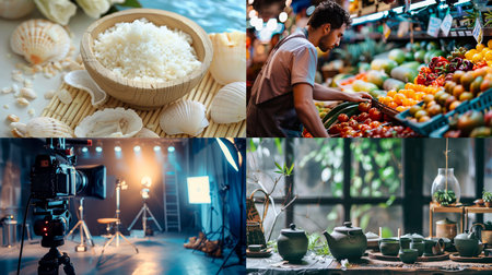 A diverse collage featuring natural materials, a bustling market, a professional studio setup, and a serene teahouse environment.