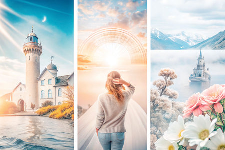 Woman walks ethereal path, lighthouse, castle, sunrise, mountain background