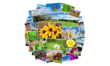 Mosaic collage with pictures of different places, landscapes, flowers, insects, objects and animals shot by myself