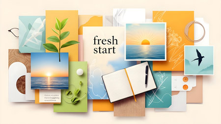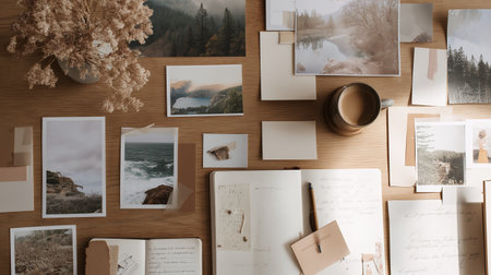 Creating a vision board with nature photos and notes on a wooden table in autumn light