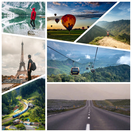 Collage of travel memories featuring scenic views, joyful moments, and cultural experiences captured throughout the years. Generative AI