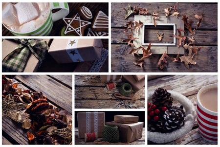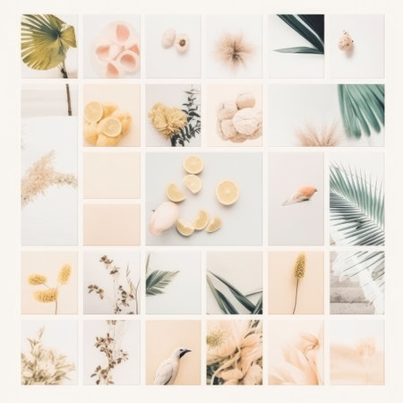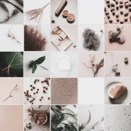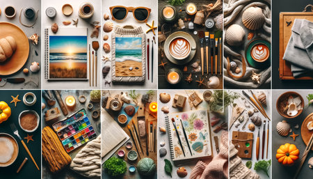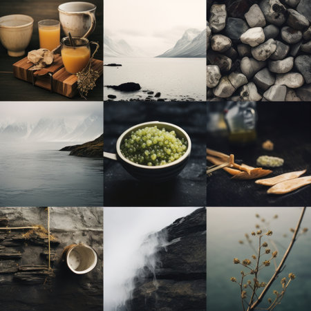Collage featuring natural materials, pottery, and culinary themes in vibrant compositions, emphasizing creativity and modern rustic aesthetics.