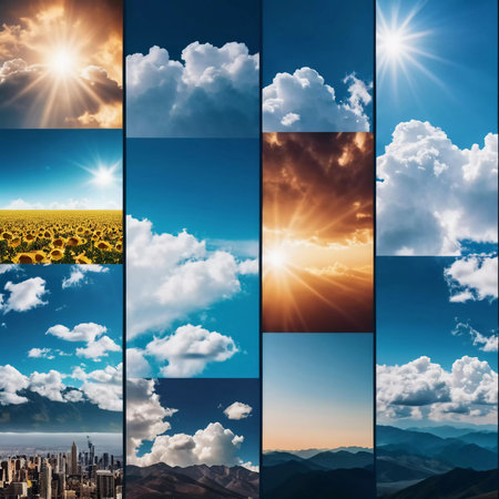 Collage highlights the beauty of skies under varied weather conditions, showcasing sunlight, clouds, and the impact of climate on urban and natural backdrops.