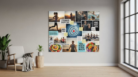 A vision board displayed on a neutral wall showcases fitness-related images and motivational messages. The composition includes a variety of pictures with vibrant colors and diverse scenes, suggesting various health and wellness concepts. The interior setting features a chair, a plant, and window, offering potential use for lifestyle, healthcare, or self-improvement projects.
