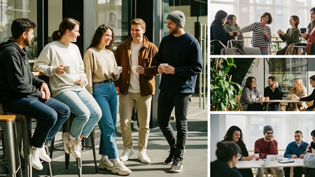Collage of young adults laughing, chatting, and enjoying coffee together in an urban park setting with trees and buildings in the background.