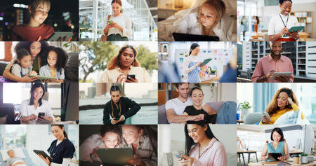 Collage, people and mobile with internet, technology and streaming for social media, video and online content. Men, women and kids on smartphone or tablet for communication, connection and search