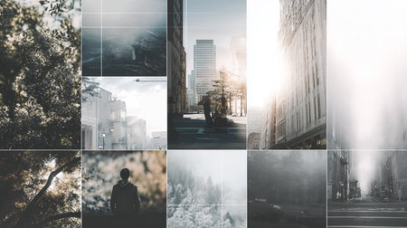 A captivating collection of diverse landscapes featuring serene trees, tranquil waters, dynamic clouds, and enchanting urban pathways, perfect for various creative projects.
