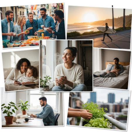 This collage presents diverse scenes of individuals engaged in varied activities. The images showcase a range of settings, from outdoor gatherings to quiet indoor moments. The visuals incorporate natural light, capturing a spectrum of colors and moods. Suitable for commercial projects or editorial content.