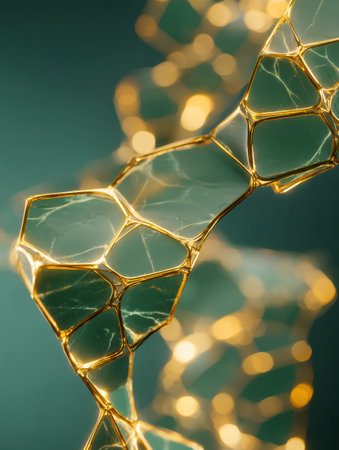 Close-up of a delicate structure featuring transparent crystals and golden accents, capturing intriguing patterns and reflections of light.