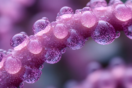 Dew droplets on a purple plant stem form a mesmerizing abstract pattern. the intricate details and rich violet hues evoke a sense of tranquility and beauty in nature, offering an ideal visual for creative design projects or wall art. Generative AI
