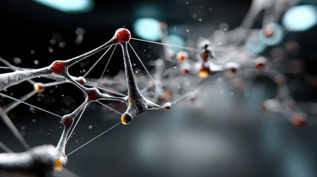 This abstract image depicts a molecular structure with connections and nodes, highlighting the intricate beauty of science and innovation in a laboratory context.