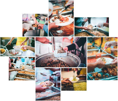 Food Donation Concept: Homeless hands get free food from volunteers