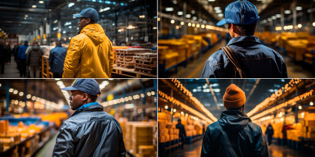 Collage of 4 photographs Unique art created with the help of artificial intelligence, depicting a worker wearing a blue jacket and yellow cap. Ideal for decorating warehouses or industrial premises.
