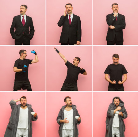 Collage of young man in different type of occupation isolated on pink background