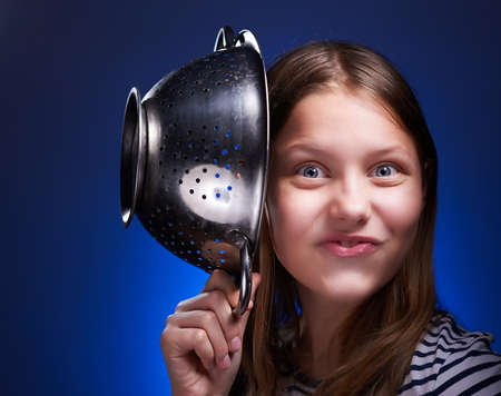 Funny teen girl with a colander on her head. Half of the face
