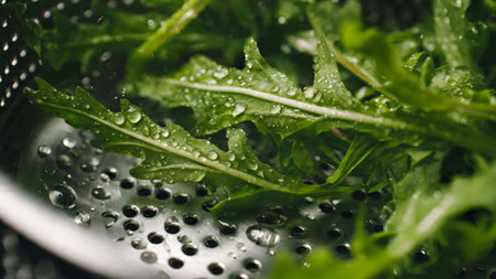 Close-up of fresh arugula leaves in a colander, covered with water droplets, ready for a healthy salad.