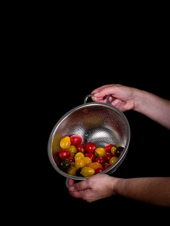 Ripe cherry tomatoes being tumbled and poured down into a silver metal colander with white background.
