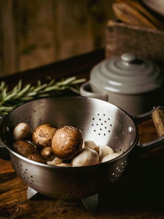 Fresh mushrooms in a metal colander on a wooden table